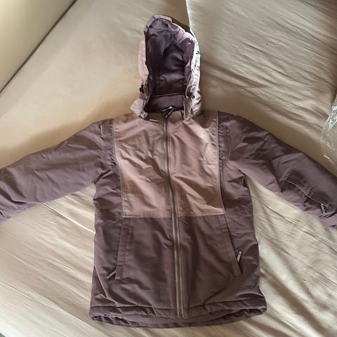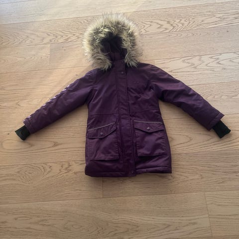 Hummel vinterjakke i marineblå med avtagbar hette. Lomme foran på magen. Pent brukt men bruksmerker foran, se bildet.