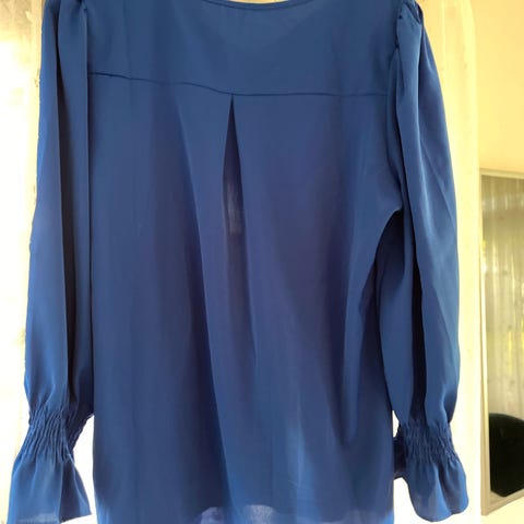 Lindex bluse, ubrukt. 60% polyester og 40% viskose. Fløyelsknyttebånd i halsen. Perleknapp øverst ved hals og på ermer. Fargen er mere mot kremfarget enn hvit.