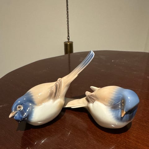 Figur som viser en jente iført blå kjole og hvitt hodeplagg, som holder en katt. Laget i keramikk eller porselen, med detaljer i blått og hvitt. Passer som dekorasjon.