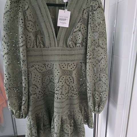 OSMINE af Nor kjole i størrelse 36. Men kan også passe en liten str 38. Kjolen er svart med lett skimmer. Den har lange ermer og en v-formet utringning. Designet inkluderer en innsvingt midje og et lagdelt skjørt. Den er aldri blitt brukt.