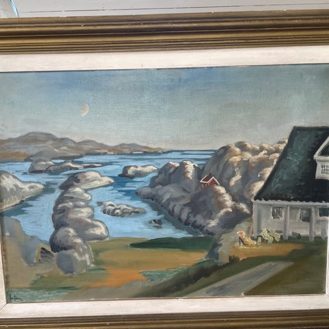 Flott oljemaleri fra Svenner fyr i en ramme, mørk blå, str. 70x80.