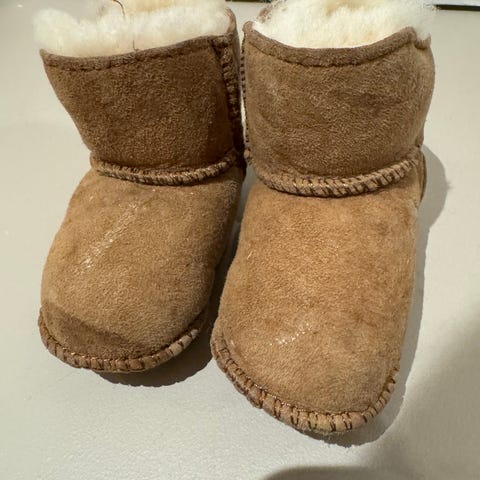 UGG babytøflene er lysrosa og har mykt, varmt ullfôr. De har dekorative sløyfer og en myk såle med mønster. Skoene fremstår som nye i original eske.
