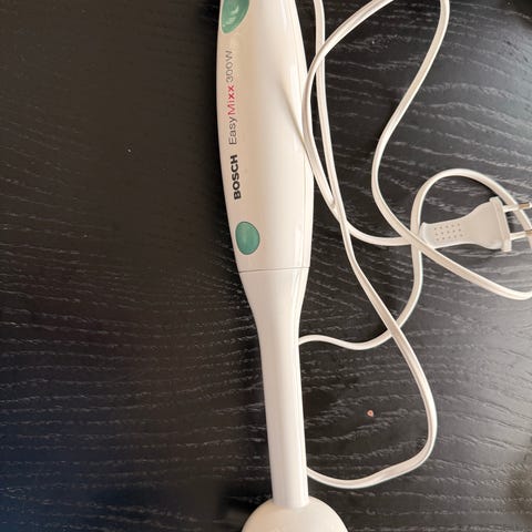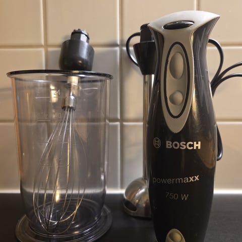 Bosch stavmikser med tilbehør inkludert visp, hakker og målebeger. Farge hvit. Egnet for miksing, hakking og visping i kjøkkenet.