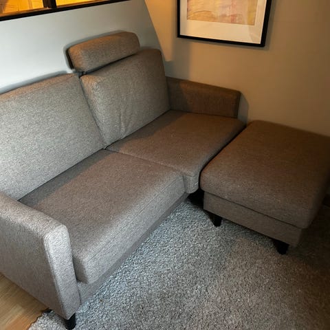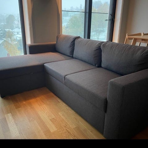 Pent brukt, stor hjørnesofa. Vært i hus med hund. Bilde nr 3 viser en glippe mellom putene. Kan hentes iløpet av uke 1 eller 2.