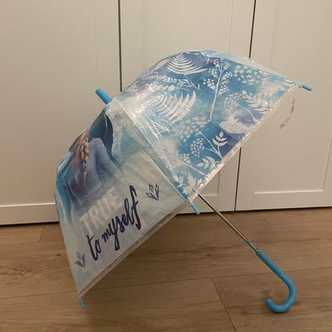 Disney Frozen II barneparaply med motiv av karakterene Elsa, Anna, Olaf og Sven. Paraplyen har flere farger og er designet for barn.