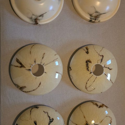 4 gamle lampeskjermer i gulfarget glass selges. Flotte til oppussing eller ombygging av taklampe. Må hentes.