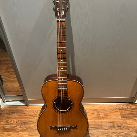 Akustisk gitar med trekropp og trehals. Gitaren har seks strenger og tradisjonell form. Den viser tegn på bruk og slitasje, inkludert sprekker i treverket. Passer for akustisk spilling.