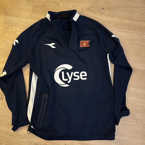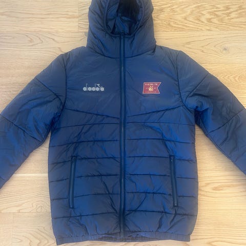 Ubrukt Viking fotball vinterjakke fra Diadora. Har to stk. i str. L (180 cm), én med Vikinglogo i front og en uten. Kan også brukes av en M. Lett jakke med syntetisk dun. Jakken har fast hette og praktiske glidelåslommer i siden. Ny pris 1199,-.