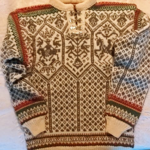 Selger denne nydelige hjemmestrikkede ullgenseren. Genseren er strikket dobbeltråd og klør ikke. Størrelsen er alt fra en S-L avhengig av hvilke passform man vil ha.