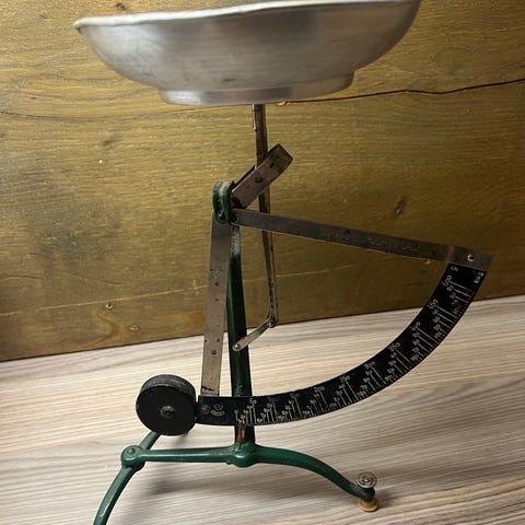 Gammel Vekt med metallvekter, brukt til måling av gjenstander. Består av en metallramme med to skåler for plassering av gjenstander og vekter.