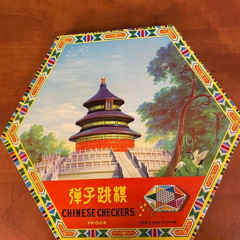 Kinesisk sjakk brettspill med brikker i to farger, laget av glass. Brettet har et tradisjonelt kinesisk design med rutenett og kinesiske tegn på brikkene. Egnet for to spillere.