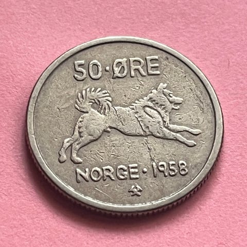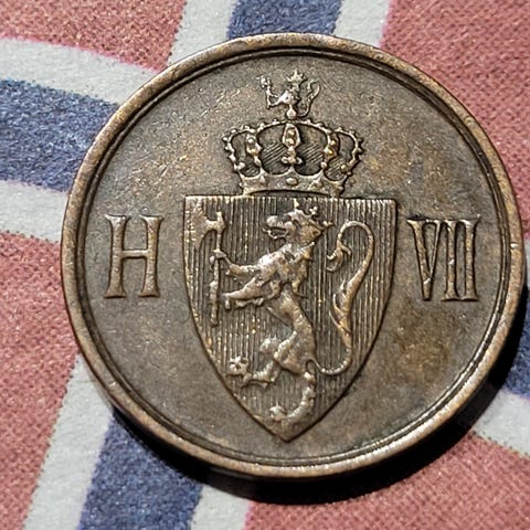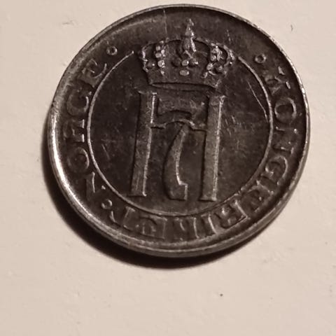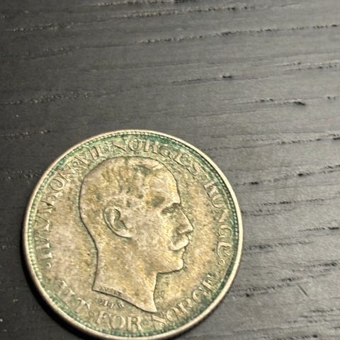 Norsk 1 krone mynt fra 1917 med motiv av kong Haakon VII på forsiden og riksvåpenet på baksiden.
