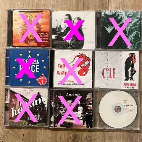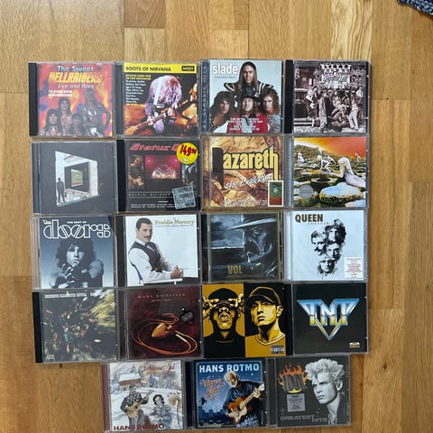 En samling av musikk-CDer i standard størrelse, med ulike artister og sjangre, alt fra klassisk og rock til mer ukjente artister. CD-ene er pakket i plastomslag og oppbevart i esker. Selges samlet.
