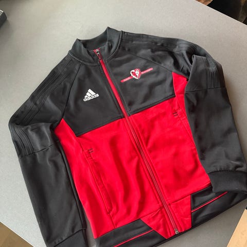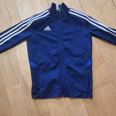 Adidas fotballjakke for barn i størrelse 140. Jakken er svart med hvite detaljer og har glidelås foran. Egnet for bruk ved fotball og annen aktivitet.
