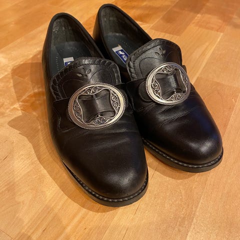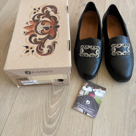 Klaveness bunadssko modell ‘Gerd’ i str. 6 eller str. 39. Pent bruke sko med litt bruksmerker, men ingen skader. Bare brukt et par ganger før de ble vokst ut av.