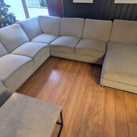 Selger stilig og pent brukt hjørnesofa med mørkt grått trekk i ull. Bjørke-ben. God sittekomfort, plass til minst 6 personer, og er også veldig god å ligge på. Det er et lite hull i det ene trekket i hjørnet av sofaen, se bilde. Dette var der når vi kjøpte sofaen for ca 2 år siden og har ikke blitt større. Det har nylig også blitt en løs søm på den ene puten, den er lite synlig, men er vedlagt bilde av. Kan enkelt syes. I tillegg hadde vi tidligere en katt som klorte på det ene lenet, se bilde. Sofaen er jevnlig støvsugd, luftet og rengjort, og står i et røykfritt hjem. Prisen er satt lavere grunnet skadene i trekket.