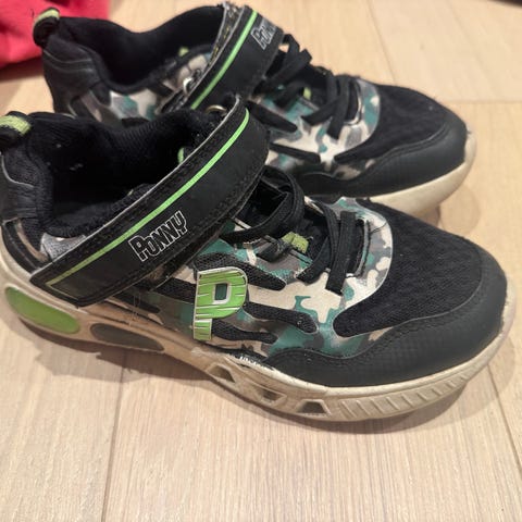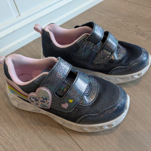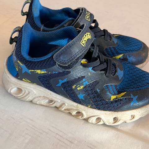 Joggesko til barn i størrelse 30 selges. Blinkesko som lyser når barnet går. Praktisk borrelås og elastiske lisser som gjør dem enkle å ta av og på. Godt brukt med synlig slitasje, men fungerer fint som reservesko eller til utelek.