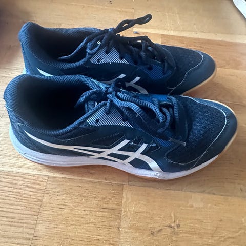 Asics hallsko i størrelse 39,5. Skoene er hvite med blå detaljer og har en gummisåle. Designet for innendørs bruk. Sålen inni den ene skoen slitt