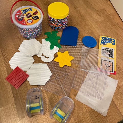 Hama perler i plast og forskjellige farger. Former i stjerne og delfin. Strykepapir 4 stk, følger også med en bruksanvisning i flere språk.