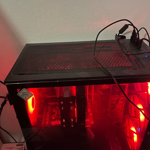 Kabinettet har ventilasjon med flere vifter og et sidepanel i glass som viser det interne oppsettet.