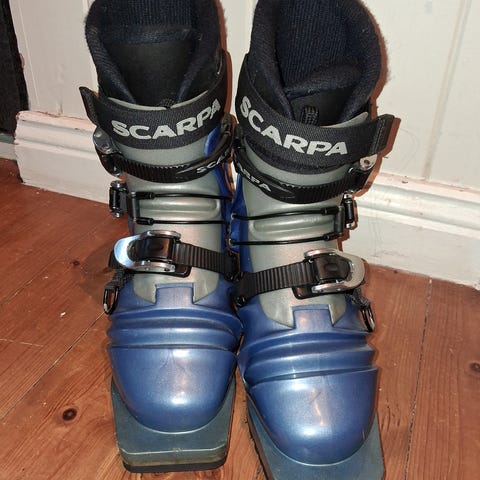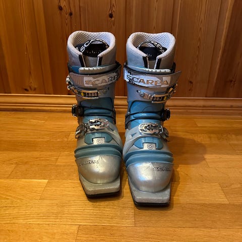 Scarpa T1 thermo telemarkstøvler str. 39. Innerskoen kan varmebehandles for å spesialtilpasses foten. Meget pent brukt, men har stått i boden noen år. Alle spenner fungerer, og flexen er fremdeles god.