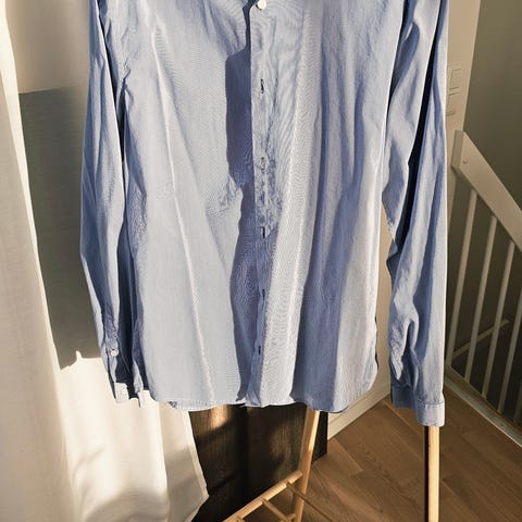 Skjorte i stripet, sort og hvit, design, størrelse L for herre. Passer til ulike anledninger og kan kombineres med flere antrekk. Fra HM