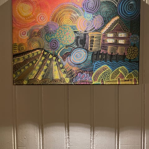 Maleri med abstrakt naturmotiv i grønne, blå, brune og svarte farger. Motiv viser stiliserte trær og vann. Utført med tydelige penselstrøk på lerret.