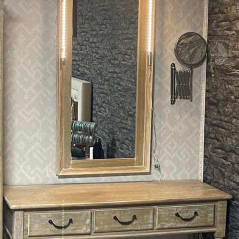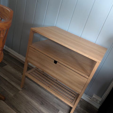 Pent brukt rundt nattbord med hylle og skuff. Kan også brukes som stuebord. Kan med fordel få et nytt malingsstrøk, men bordet er pent slik det står nå. (Bilder er tatt med blitz).