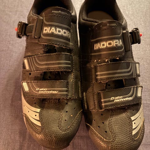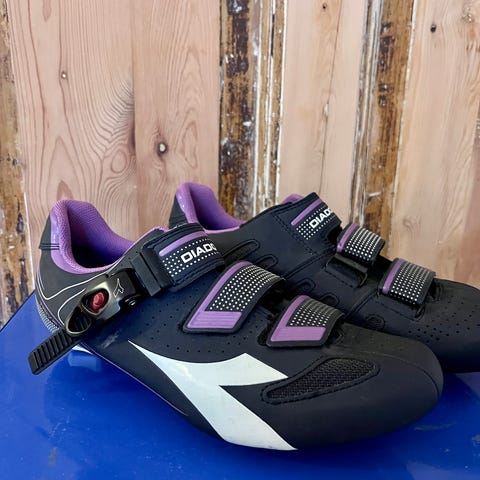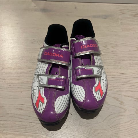 Diadora sko i størrelse 39, hvit med lilla detaljer. Skoene har borrelås for lukking og er utstyrt med klikkpedal-feste under sålen. Materialet er syntetisk og egnet for sykling eller lignende aktiviteter.