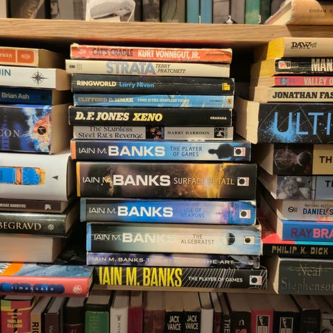 En samling av skjønnlitteratur med fokus på science fiction, inkludert titler av forfattere som John Scalzi og andre. Bøkene varierer i størrelse og omslagsdesign, og er egnet for lesere interessert i science fiction og relaterte sjangre. Pris er for alle samlet 😊 håper de kan være til glede for andre også