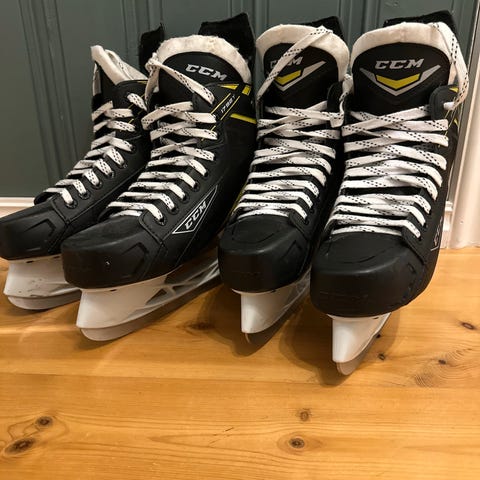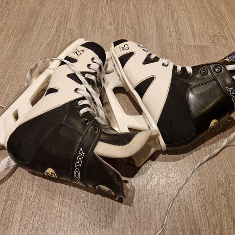 CCM C-52 ishockeyskøyter i størrelse 45. Skøytene er designet for ishockey og har en svart farge med gule detaljer. Materialet og konstruksjonen er tilpasset for bruk på is for ishockeyspill.