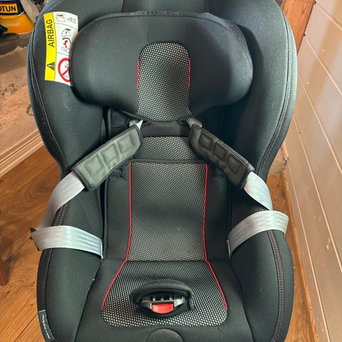 Britax Römer Max-Way Plus barnesete med kapasitet opptil 25 kg. Setet er designet for bakovervendt transport av barn i bil. Monteres med bilens eget belte og i setet foran med egne belter. Belter til montering og beskyttelse mellom bilsetet og barnesetet medfølger.