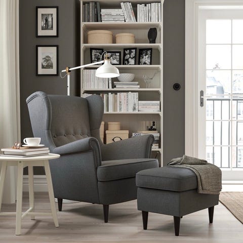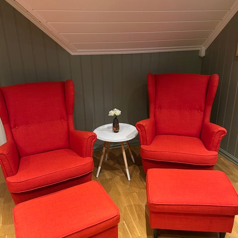 Selger to stk Strandmon stoler og tilhørende fotskammel fra IKEA. Stolene er i blå velur, hele og pene.