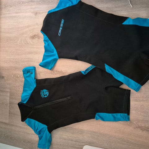 Selger denne våtdrakten rimelig pga noen hull, se bilder. Ene hullet er på kneet, andre på rumpen (hadde uansett badebleie på dette stadiet, så for oss var det ikke så nøye). Brukt til bading når det er litt kaldt i vannet.