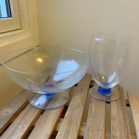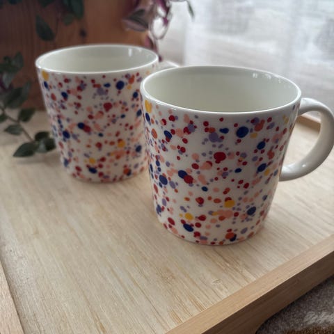 Iittala serviseboller i forskjellige farger og mønstre. Settet inkluderer boller med blått og rødt blomsterdesign, en gul bolle, og en bolle med svart-hvitt mønster. Passer til servering av småretter og snacks.