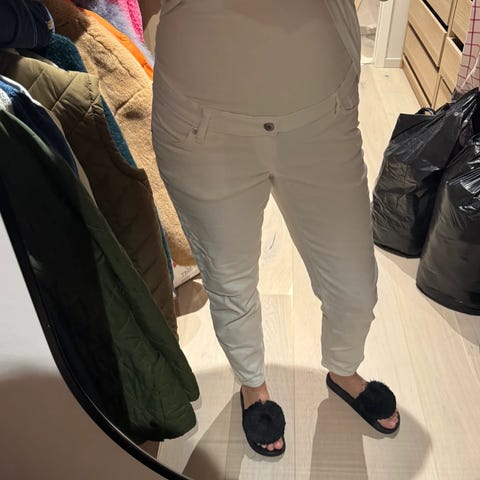 Lys beige tigts er ubrukt, og vide blå gravidjeans er brukt 1 gang.