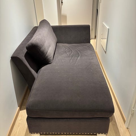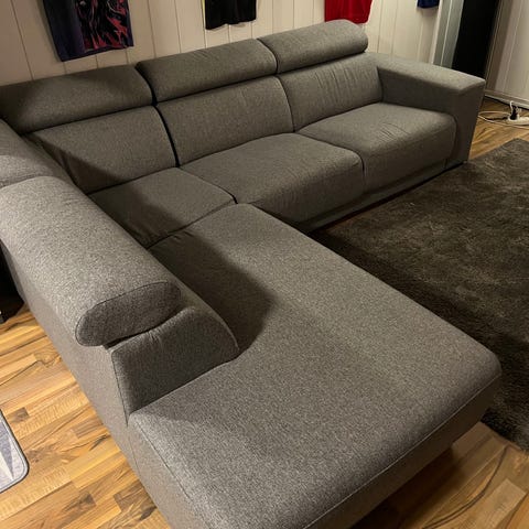 Sofaen har vært brukt i 3 år .må hentes senest 5. januar. Den er delt i tre deler, enkel å transportere. Noen av setene har en ødelagt kjetting som på bilde nr. 2, men ikke synlig forfra. Trekkene er avtagbare for vask i vaskemaskin.