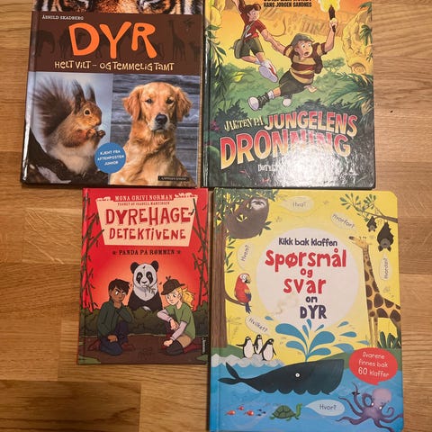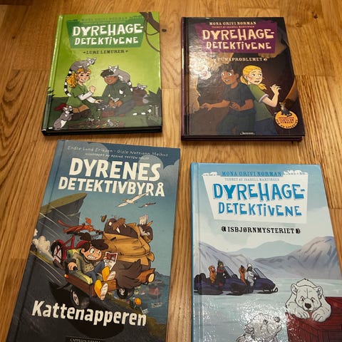 Dyrehage Detektivene barnebøker i ulike utgaver med fargerike omslag. Serien inkluderer flere titler som omhandler dyrehage-tema og detektivhistorier for barn. Hentes på Skoppum.