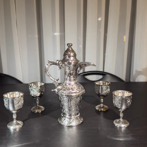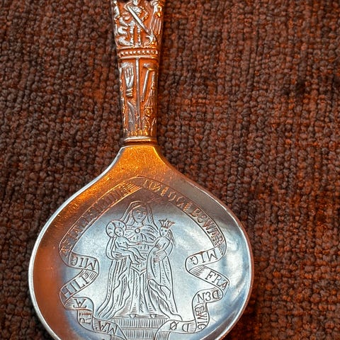 Hvit Rose sølvskje med dekorativt mønster på skaftet. Skjeen har en rund skål og er laget i sølv. Den har gravering med initialer og dato.