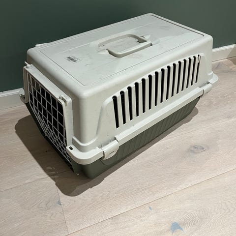 Transportbur for kjæledyr laget i plast med metallgrind. Buret har håndtak på toppen for enkel bæring og ventilasjonsåpninger på sidene. Passer til transport av små til mellomstore kjæledyr.