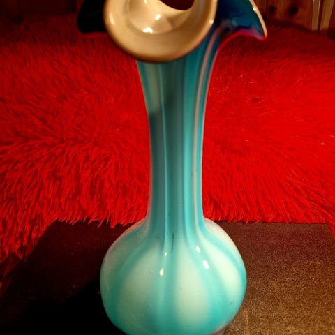 Glasskrukke med håndtak i gul og hvit farge. Krukken har en avrundet form med smal hals og bred base. Den har en dekorativ tekstur og et håndtak som er delvis hvitt med flekker. Egnet til dekorative formål.