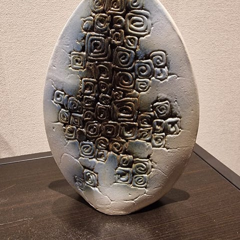 Tenmoku Pottery «Twigs» vase selges. Vasen har en flat, oval form med innrisset mønster av grener. Fargepaletten er dempet med jordtoner, hovedsakelig lys beige og brunt.