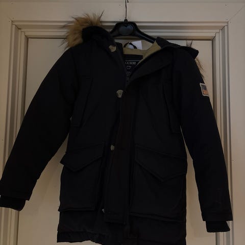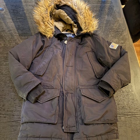 Svea jakke i størrelse 150, farge svart. Foret, og kan snøres i livet om ønske (inne i jakken). Hette med pelskant, både pelskant og hette kan tas av. Pent brukt.