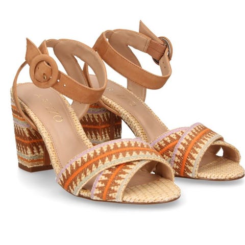 Calvin Klein hæler i størrelse 38,5. Skoene har et unikt design med flere stropper og er laget av et tekstilmateriale med en naturlig beige farge. Hælene er tynne og har en brun farge med tekstur på undersiden. Skoene er beregnet for kvinner.