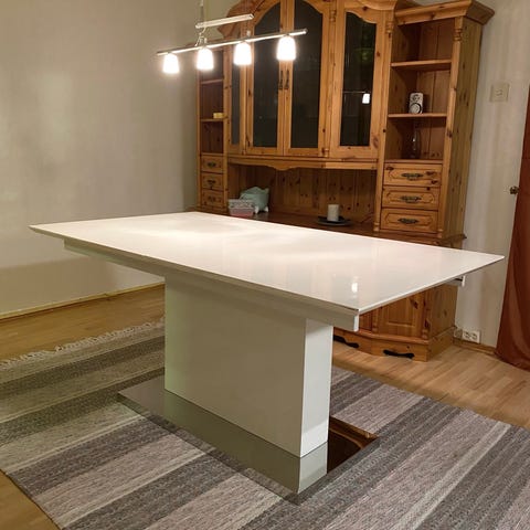 Bohus spisebord med hvit høyglans overflate. 160cm /220cm. Bordet har en rektangulær form med en solid sokkel i midten. Passer til bruk i spisestue eller kjøkkenområde. ileggsplate på 60cm med folie. Total lengde med plate er da 220 cm. Er hvit høyglanns under folie. Godt brukt men mye bord igjen. Bordet er veldig tungt så du må ha med bærehjelp da jeg ikke kan hjelpe til. Må hentes raskt. NB: KUN bord. IKKE stoler.