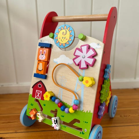 Morsom og utviklende lær-å-gå-vogn fra Viga. Vognen har flotte håndmalte detaljer og er tilvirket i tre av høyeste kvalitet for god holdbarhet. Vognen er kombinert med morsomme aktivitetsleker for at barnet skal utvikle sanser og motorikk. Vognen er utstyrt med fire smidige lysblå hjul med søte virvler.