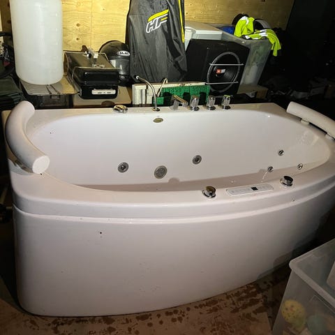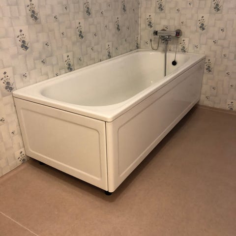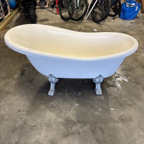 Badekar i hvit emalje med avrundede kanter og avløpshull i ene enden.