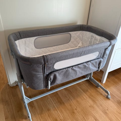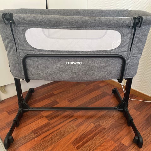 Moweo bedside crib designet for enkel montering ved siden av foreldreseng. Laget med materialer som gir god ventilasjon og komfort for barnet. Justerbare ben for stabilitet og tilpasning til ulike sengestørrelser. Må