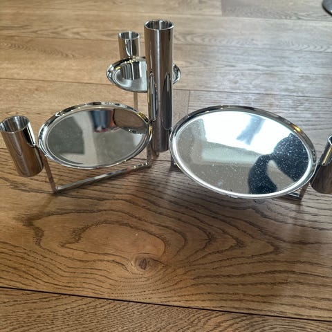 Georg Jensen Magnolia Leaf lysestake fra 2016, designet for å holde tynne stearinlys. Laget i metall med et dekorativt magnoliablad som detalj. Passer til bruk som dekorasjon i hjemmet, spesielt i jule- og vinterperioden. Selges med tre stk lys til .