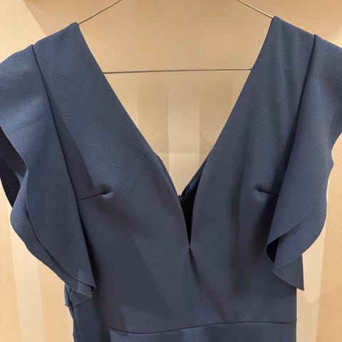 KAFFE India V-neck . Meget pen ettersittende festkjole i blå farge, størrelse M. Materiale består av 80% polyester, 17% viskose og 3% elastan. Fôret er laget av 100% polyester. Kjolen har v-hals og er designet for kvinner.